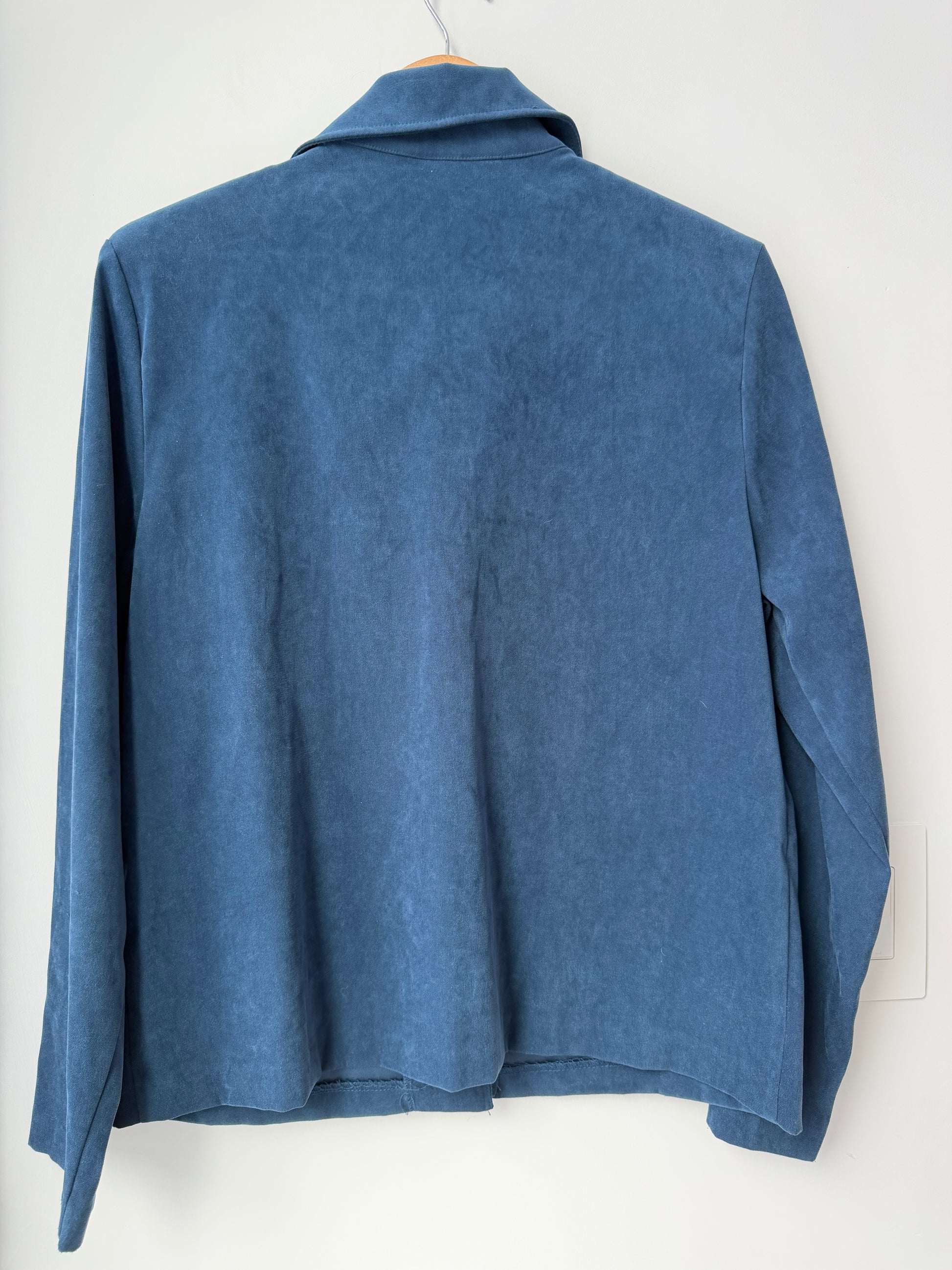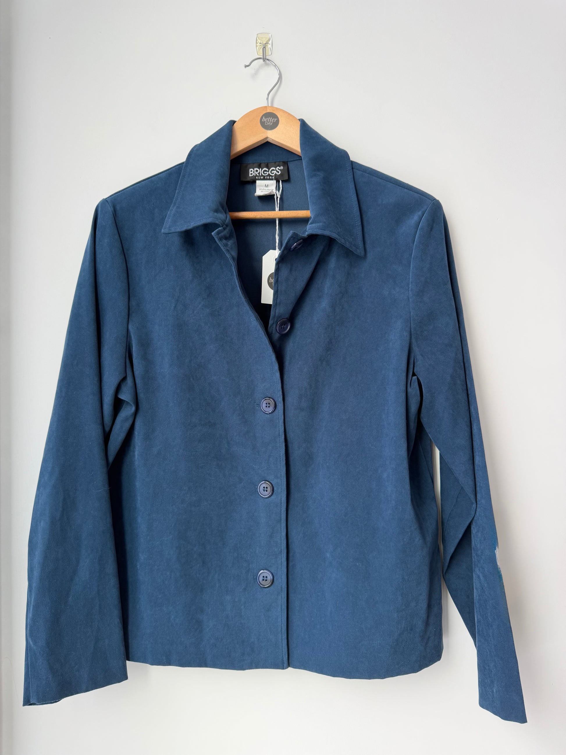 Chic navy button-down shirt by Briggs New York. Features a classic collar and button closure, with shoulder pads. Perfect for versatile styling.