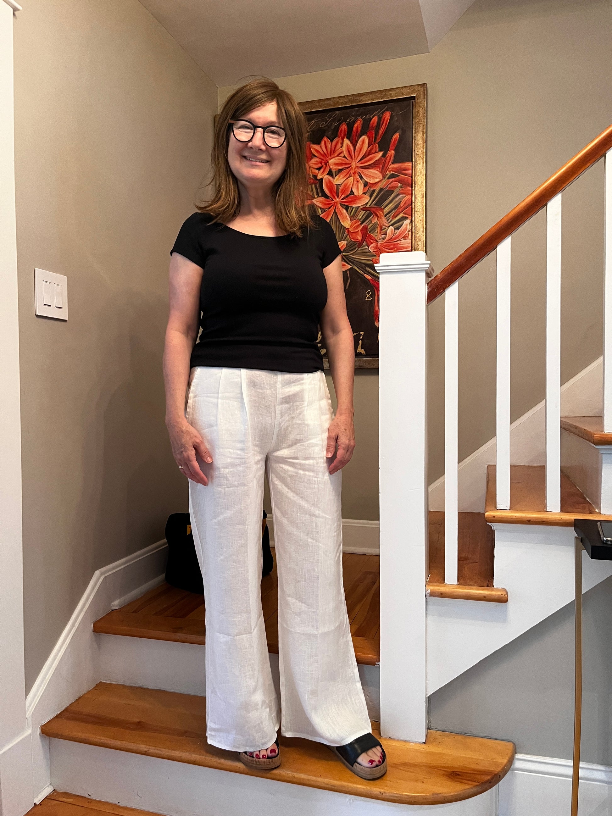 I decided to buy the white linen pants and I love them. The fit is perfect and so comfortable. I like having an elastic waist but the nice thing about it is the elastic is just in the back and the front has a nice flat pleat detail. Another thing I like is the width of the pants. They are wide but not super wide. And who doesn’t love pockets! (which are nice and deep I might add)