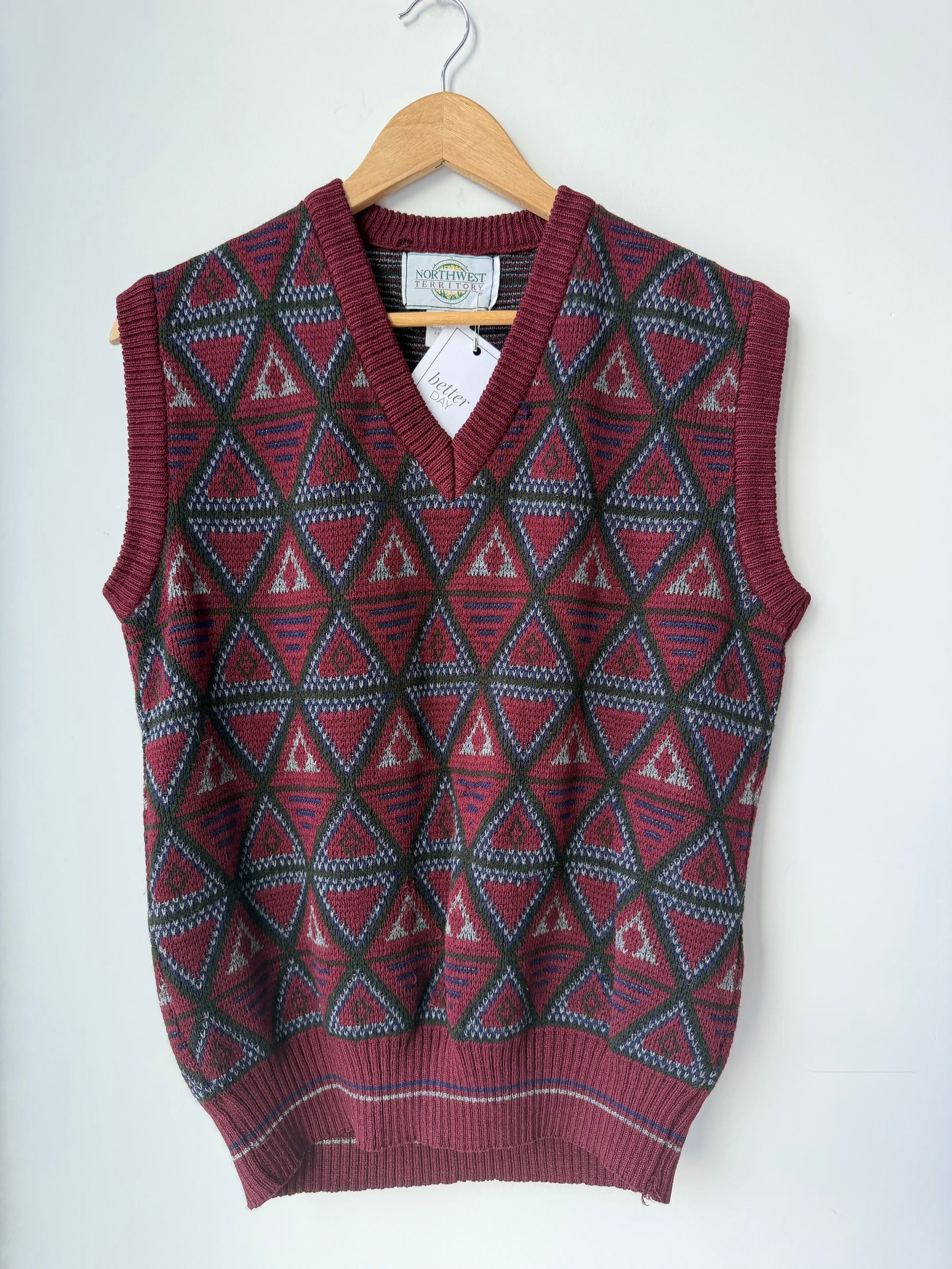 Stylish V-neck sweater vest with geometric pattern. Features rich burgundy and gray tones. Ideal for layering and adding flair to any outfit.